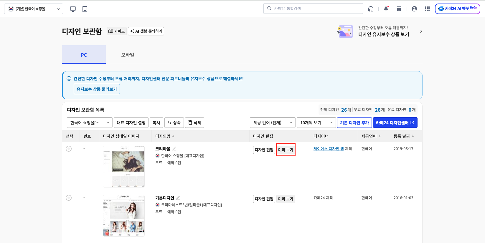 - 디자인 > 디자인 스킨 리스트 > 스킨명 확인