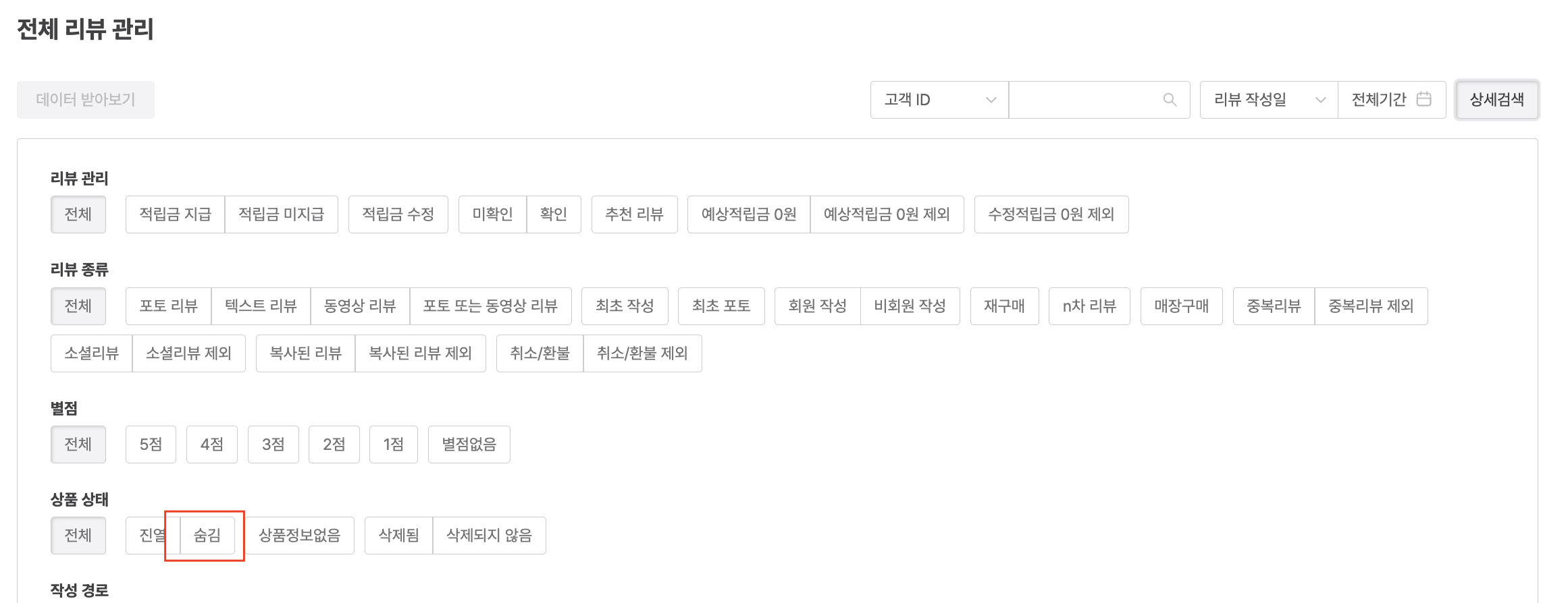 : 관리자 페이지 > 리뷰 > 리뷰 관리 > 전체 리뷰 관리 > 상세 검색 > 숨김