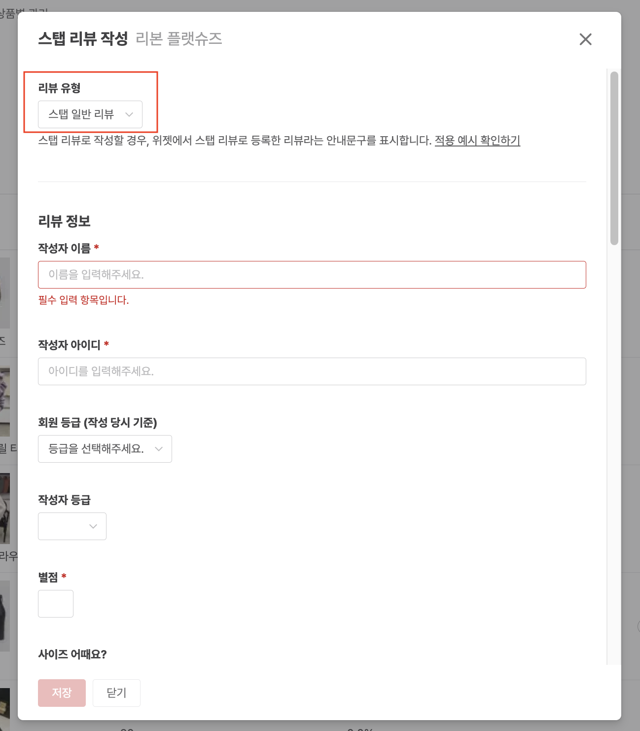 🚫 주의사항: 스탭 리뷰(소셜 리뷰 포함)에는 '표시 정보 및 디자인 - 작성자 표시방법' 설정이 적용되지 않습니다. 이 설정은 작성자 등급이 회원인 리뷰에만 해당됩니다. 스탭 리뷰의 작성자 정보 마스킹이 필요하다면, 해당 리뷰의 '작성자 등급'을 회원으로 변경해 주세요.