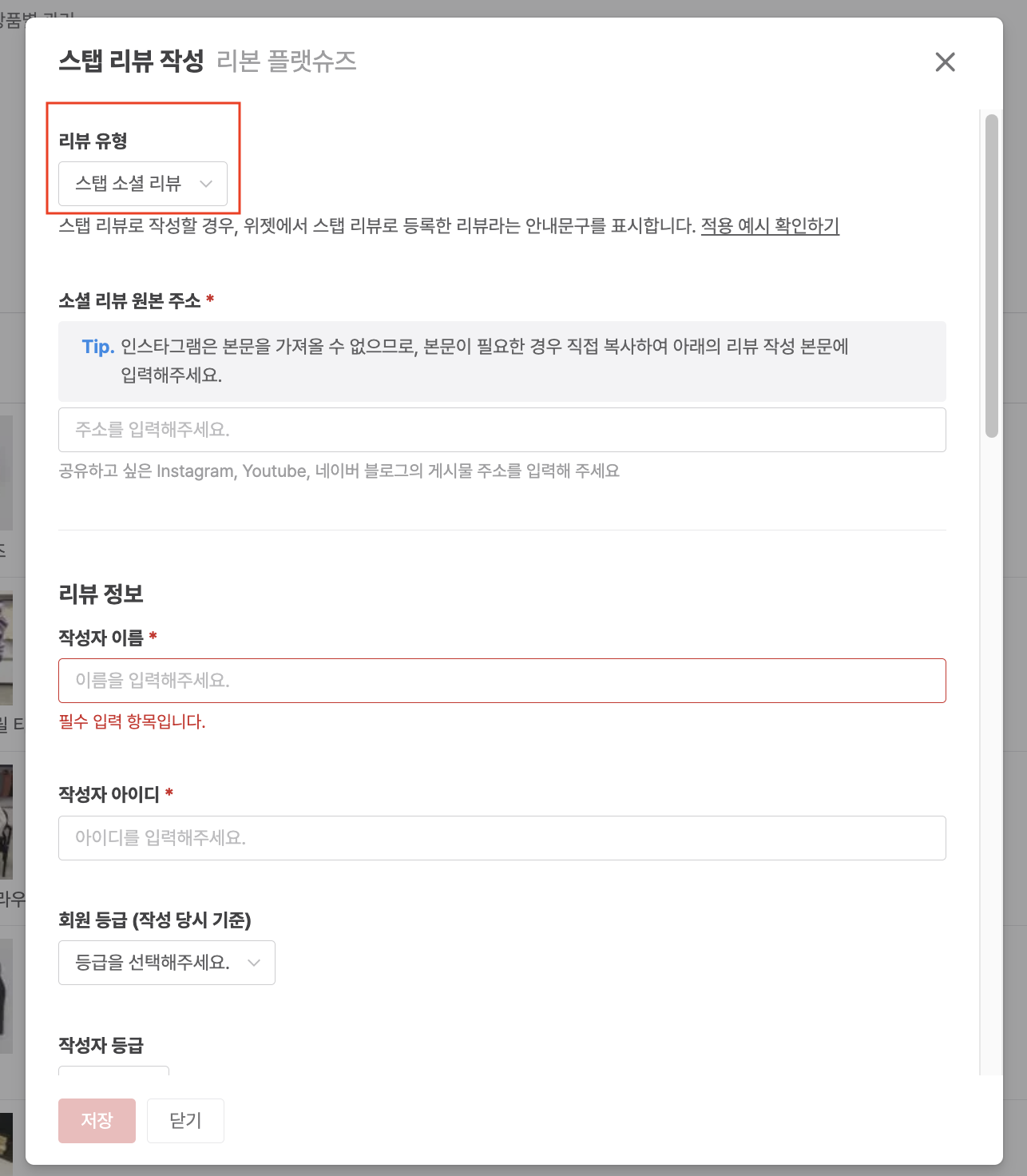 스탭 소셜 리뷰는 관리자가 사진/동영상이 첨부된 소셜 미디어의 링크를 통해 등록하는 리뷰입니다. 스탭 일반 리뷰와 동일하게 고객이 직접 작성할 수 없으며, 쇼핑몰에서 고객의 SNS 포스트를 대신 등록하는 방식입니다.