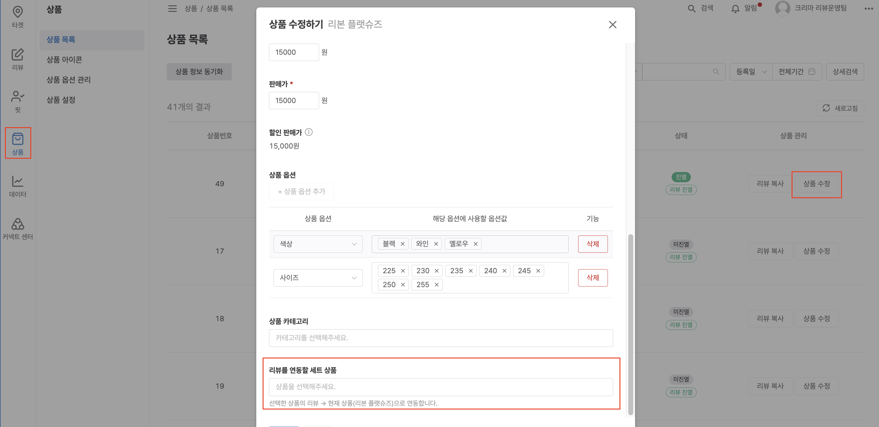 관리자 페이지 > 상품 > 상품 목록 > 상품 수정 > '리뷰를 연동할 세트 상품' 선택