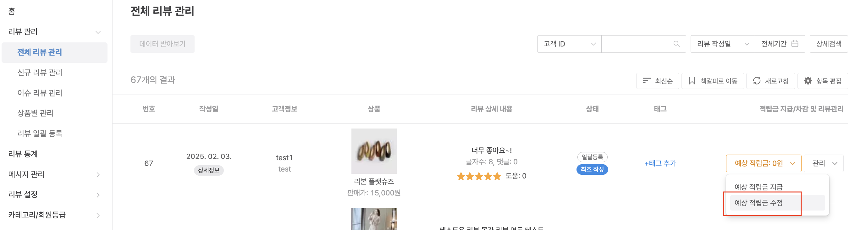 : 관리자 페이지 > 리뷰 > 리뷰 관리 > 전체 리뷰 관리 > 예상 적립금 > 예상 적립금 수정