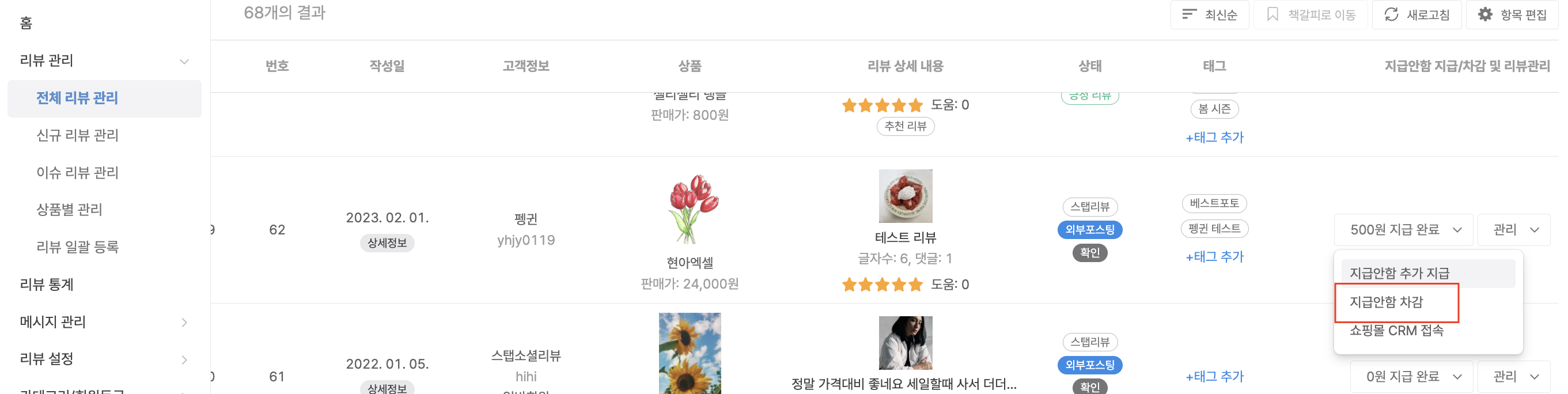 [리뷰] 적립금 지급 방법 - 적립금 지급 차감 2025년 12월 30일 03:02 업데이트 시간 적립금 지급 후 차감 방법이미 지급 처리한 적립금에 대해 지급 차감할 수 있습니다. 설정 방법: 관리자 페이지 > 리뷰 > 리뷰 관리 > 전체 리뷰 관리 > N원 지급 완료 > 적립금 지급 차감'적립금 지급 차감' 버튼 클릭 시 앞서 지급된 적립금 지급을 금액설정하여 차감 가능합니다. 차감 사유는 기입하신 적립금 차감 사유 로 자동 입력됩니다. 관련 문서 [리뷰] 적립금 지급 방법 - 추가 지급 [리뷰] 적립금을 자동으로 지급하고 싶어요. [리뷰] 적립금 지급 방법 - 예상 적립금 수정 [리뷰] 적립금 지급 사유 변경 [리뷰] 적립금 지급 방법 - 예상 적립금