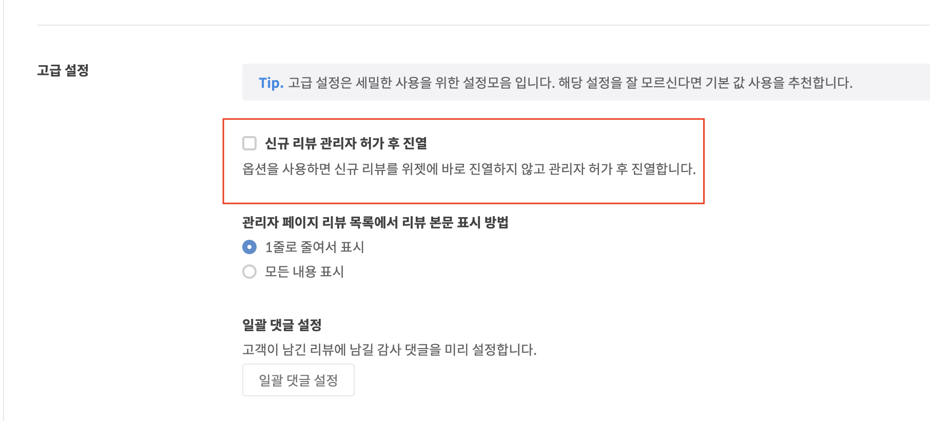 리뷰 > 리뷰설정 > 기본설정 > 관리기능의 고급 설정 보기 > 신규 리뷰 관리자 허가 후 진열