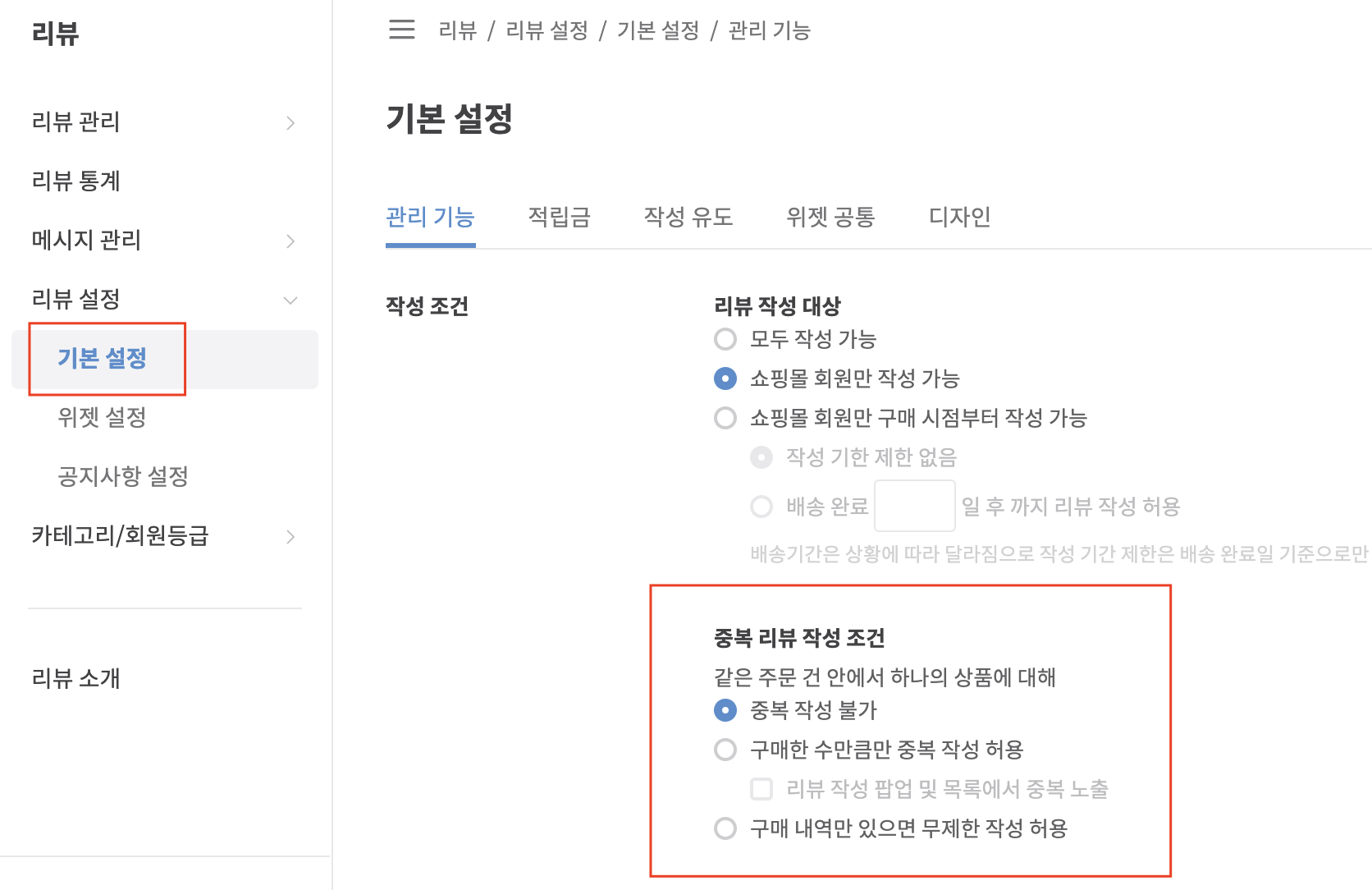 : 관리자 페이지 > 리뷰 > 리뷰 설정 > 기본 설정 > 관리 기능 > 작성 조건