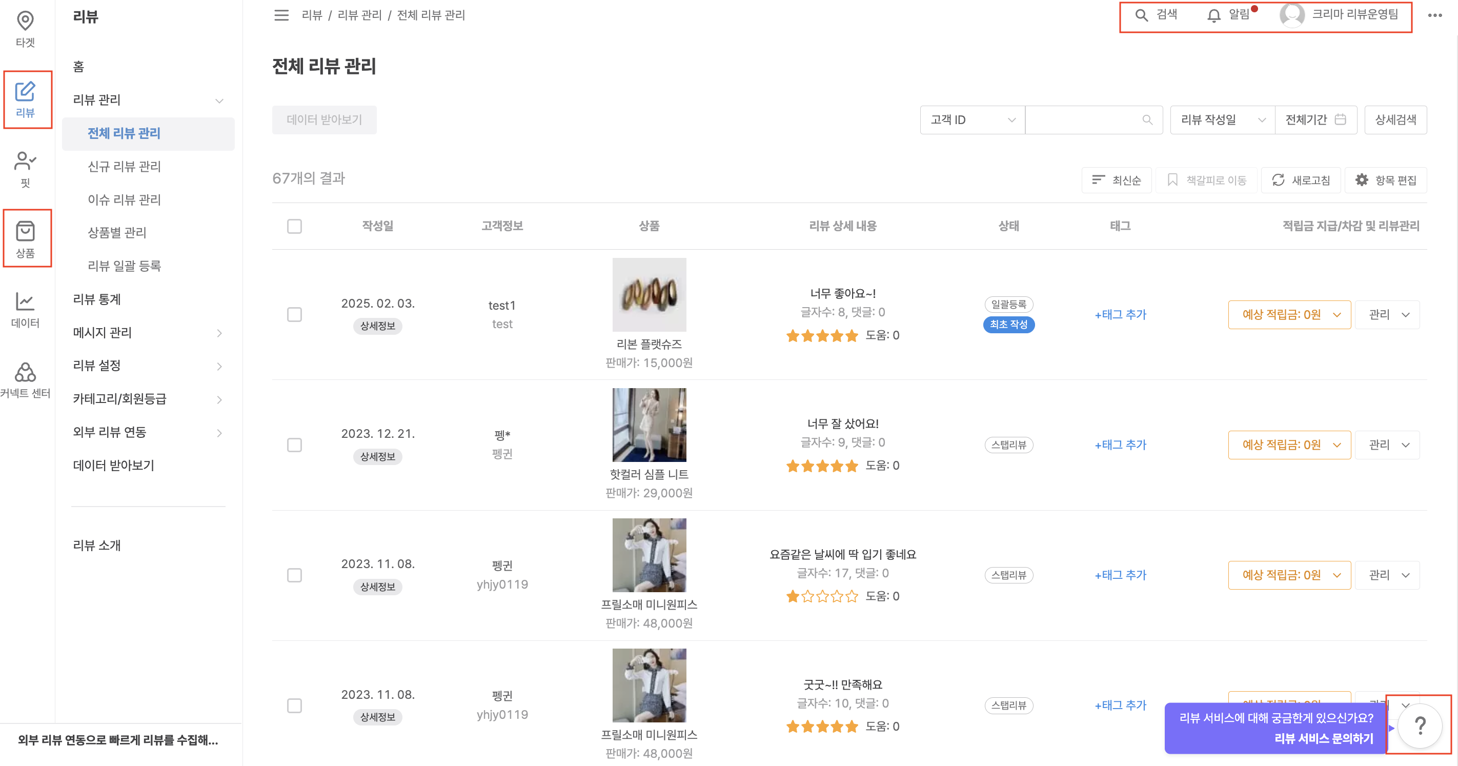 - [리뷰] 크리마 리뷰 관리자 페이지의 메뉴는 무엇이 있나요?