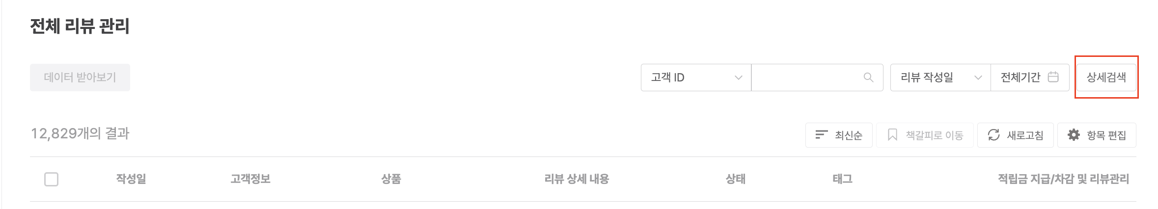 여러 리뷰의 좌측 체크박스를 체크하면 한 번에 관리할 수 있으며, 우측 상단에서 다양한 정보별로 리뷰를 검색할 수 있습니다.