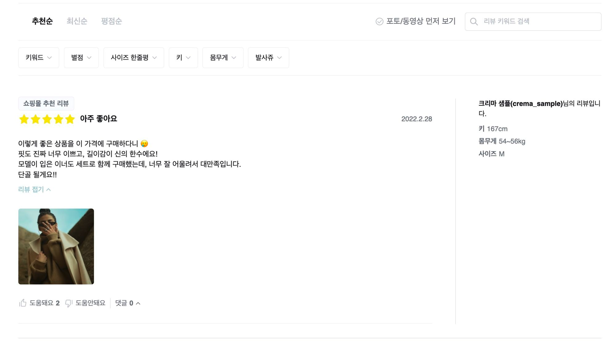 퀄리티 높은 리뷰를 상품 리뷰 위젯 상단에 노출할 수 있습니다. 추천 리뷰는 언제든지 간편하게 변경하실 수 있습니다.