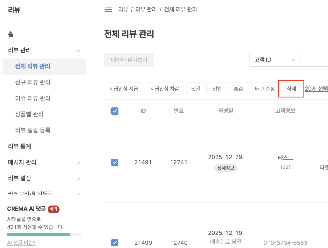 경로: 관리자 페이지 > 리뷰 > 리뷰 관리 > 전체 리뷰 관리 > 삭제할 리뷰 선택 > 상단의 [삭제] 버튼 클릭