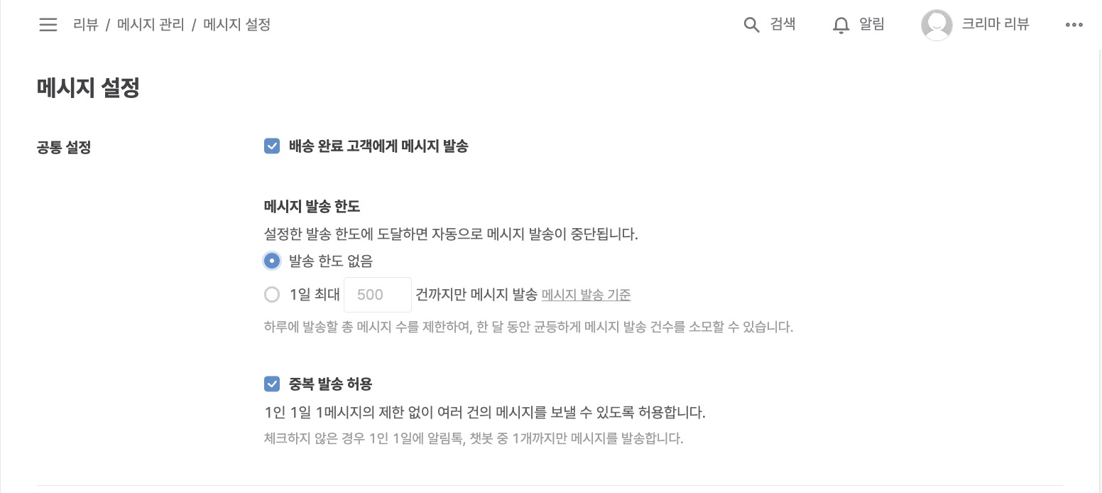 리뷰 > 메시지 관리 > 메시지 설정