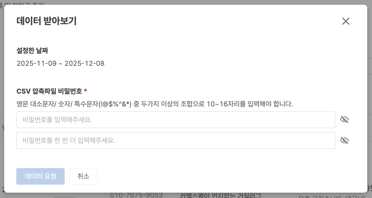 - '개인정보 열람 권한'이 없는 계정은 '데이터 받아보기' 메뉴가 노출되지 않습니다.