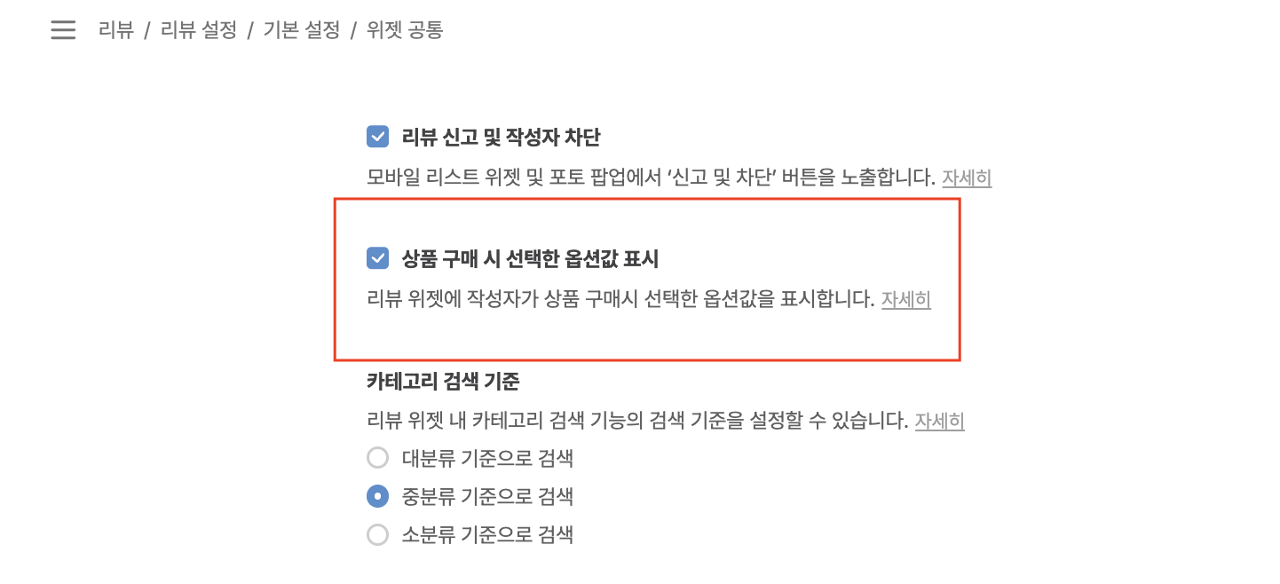 관리자 페이지 > 리뷰 > 리뷰 설정 > 기본 설정 > 위젯 공통 > 고급 설정