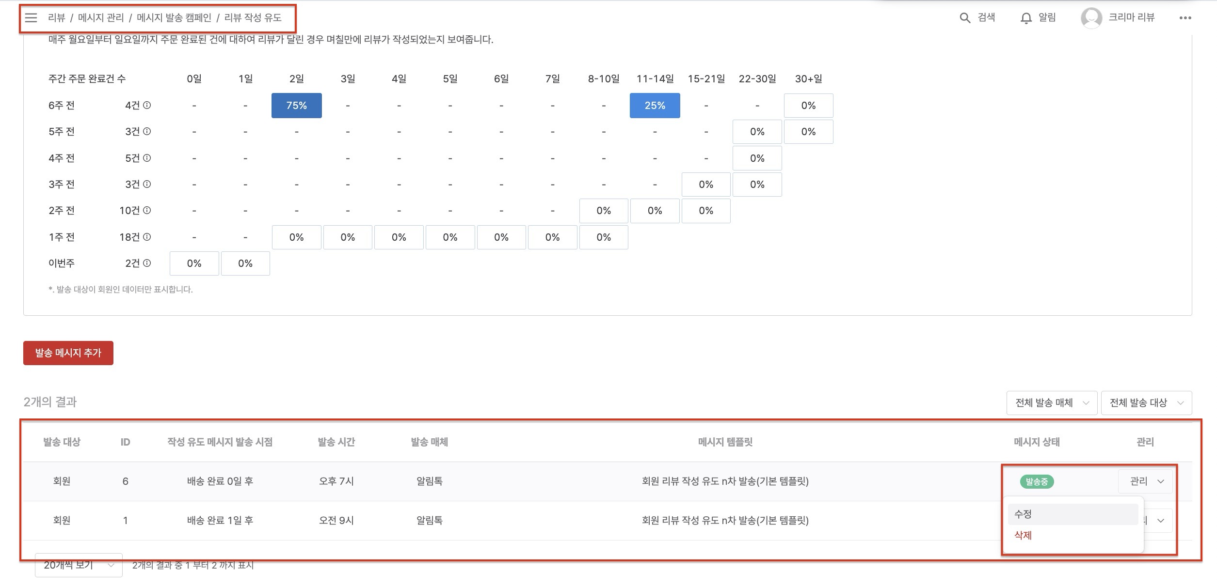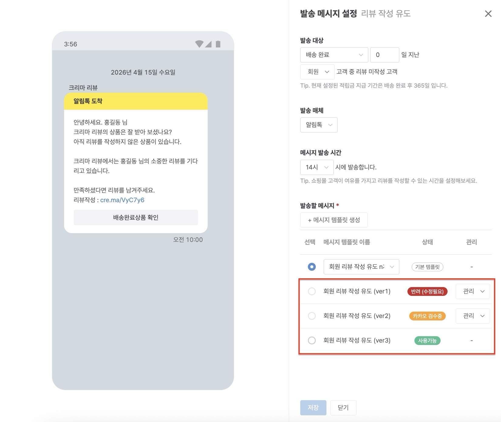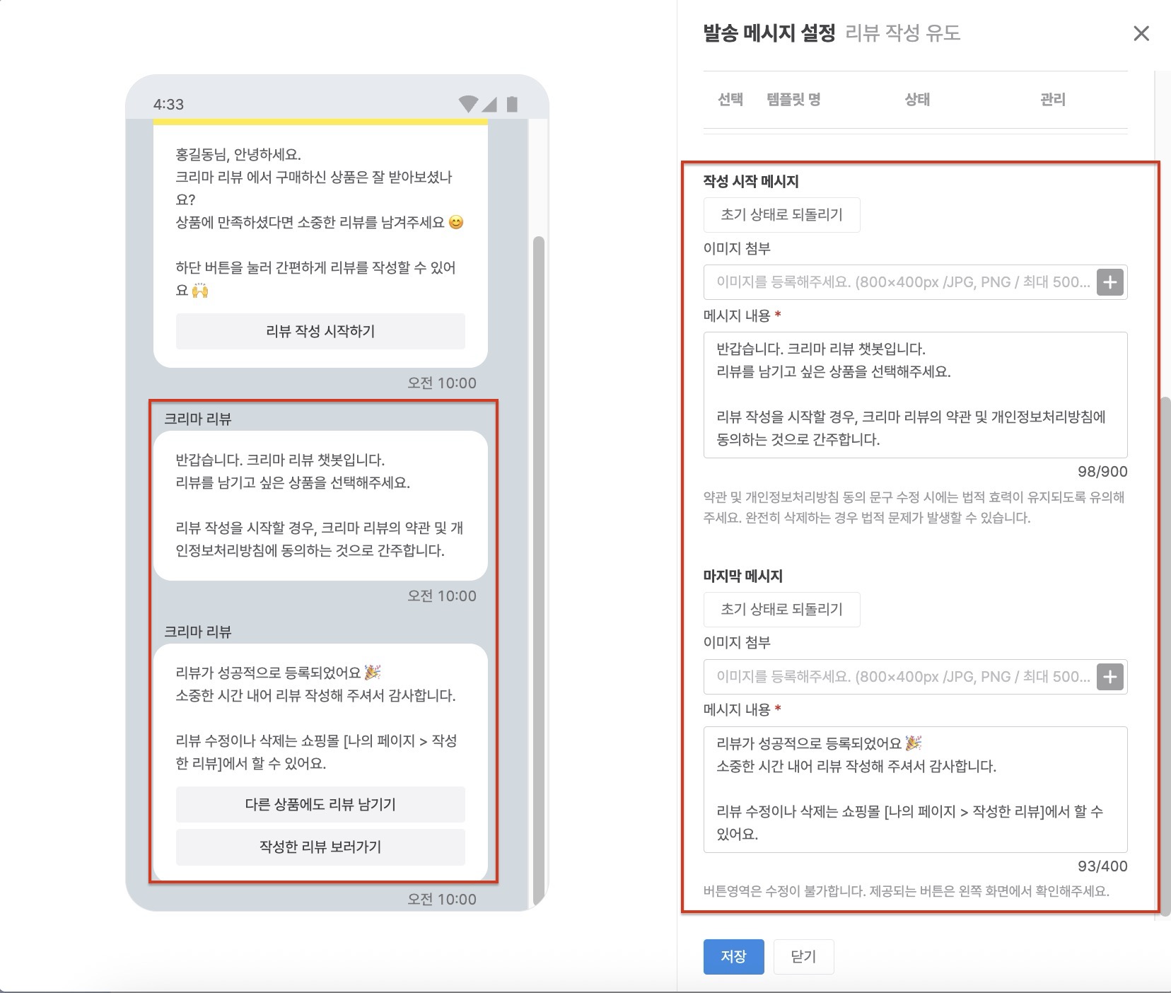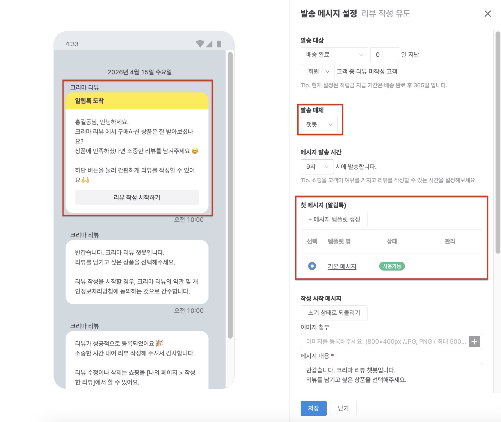 - 메시지에 사용 가능한 예약어 : 고객명, 쇼핑몰명, 쇼핑몰 대표 전화번호, 리뷰 작성 URL 키값