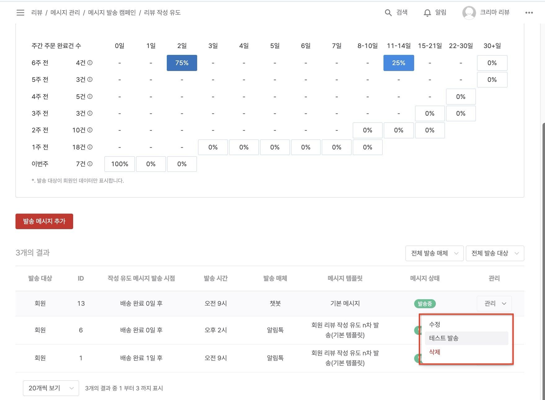 👉 리뷰 > 메시지 관리 > 메시지 발송 캠페인 > [리뷰 작성 유도] 캠페인의 '설정' 클릭 > [리뷰 작성 유도 메시지 템플릿]의 '관리 > 수정' 클릭한 후 + 메시지 템플릿 생성 버튼을 통해 템플릿을 만들 수 있습니다. 생성 후에는 카카오 검수를 요청하고, '사용 가능' 상태가 되면 발송 템플릿으로 설정할 수 있습니다.
