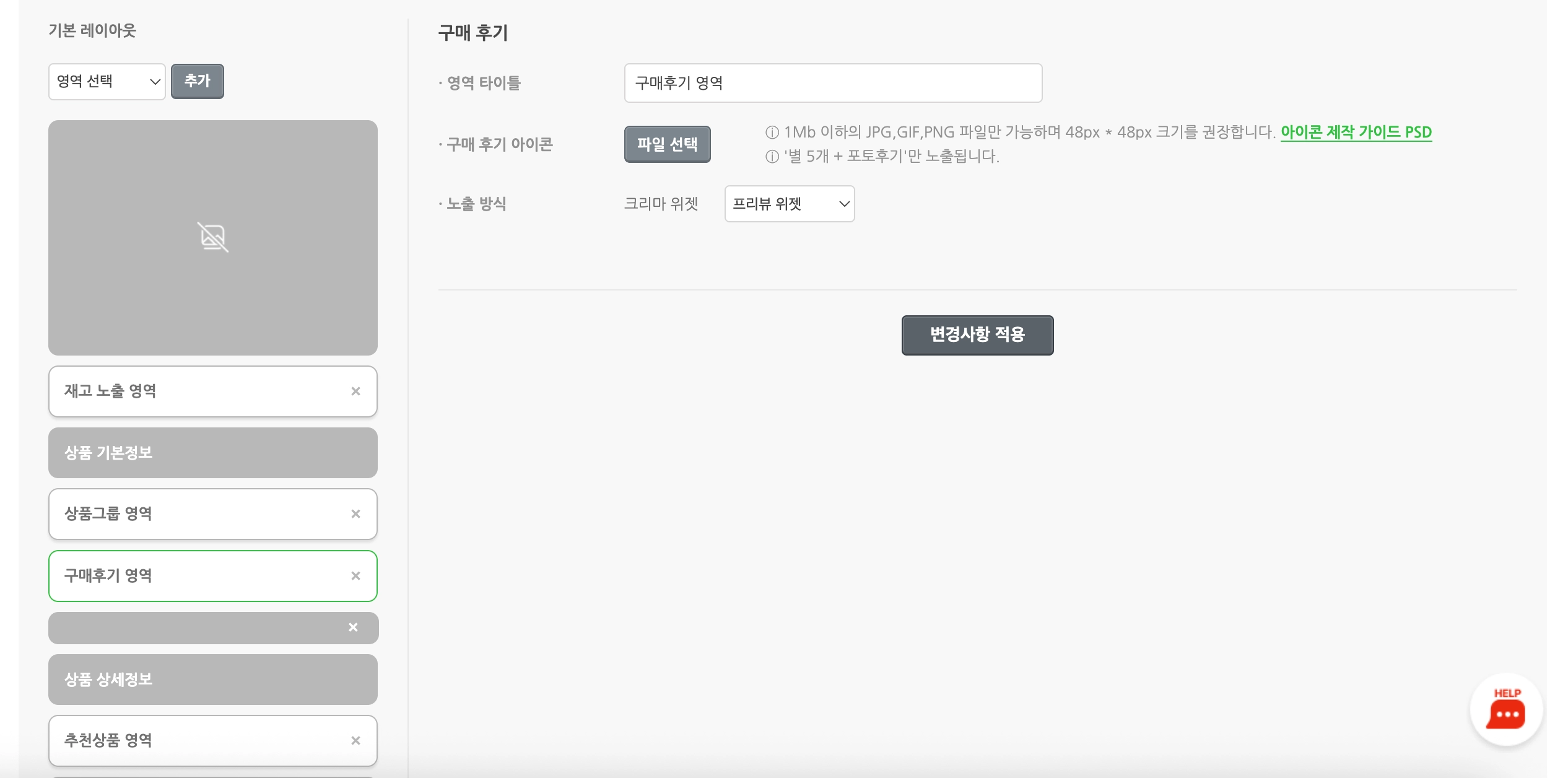 플렉스지 관리자 페이지 > 디자인관리 > 상품 상세 페이지 설정 > 구매후기 영역