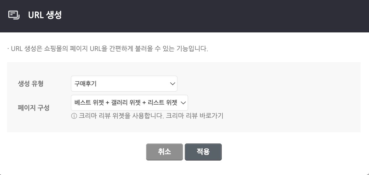 크리마 관리자 페이지 > 리뷰 > 리뷰 설정 > 위젯 설정