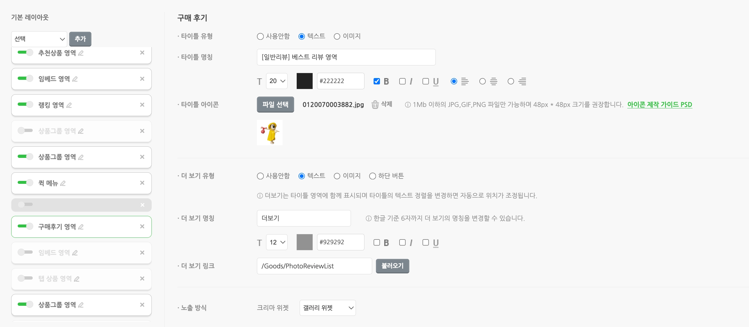 플렉스지 관리자 페이지 > 디자인관리 > 메인 레이아웃 관리 > 구매후기 영역
