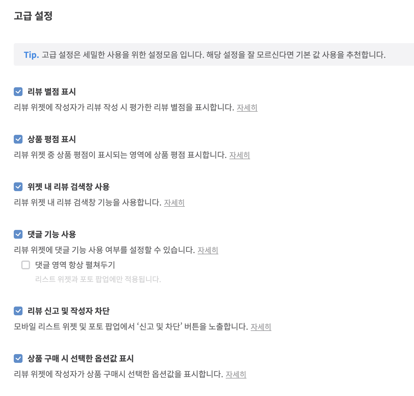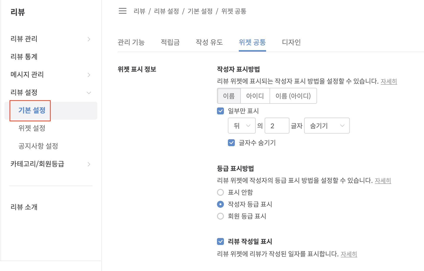 [리뷰] 위젯 내 작성자 표시 정보 수정 2025년 12월 09일 02:56 업데이트 시간 위젯의 리뷰 표시 정보란? 위젯에 노출되는 리뷰 작성자의 정보(아이디와 이름, 리뷰 작성 일자, 회원 등급 등)의 노출 여부를 설정할 수 있습니다. 위젯 내 작성자 표시 정보 리뷰 표시 정보 수정하기 : 관리자 페이지 > 리뷰 설정 > 기본 설정 > 위젯 공통 > 고급 설정 보기 고급 설정 보기 클릭 시 리뷰 별점 표시, 상품 평점 표시 등 다양한 설정을 변경하실 수 있습니다. 관련 문서 [리뷰] 추천 리뷰 지정 및 해제 - 상품 상세 페이지 [리뷰] 크리마 리뷰 관리자페이지 리뷰 메뉴 소개 [리뷰] 위젯 폰트 일괄 변경 [리뷰] 추가 수집정보를 수정하고 싶어요. [리뷰] 평점+리뷰 수 설치/변경/제거 신청