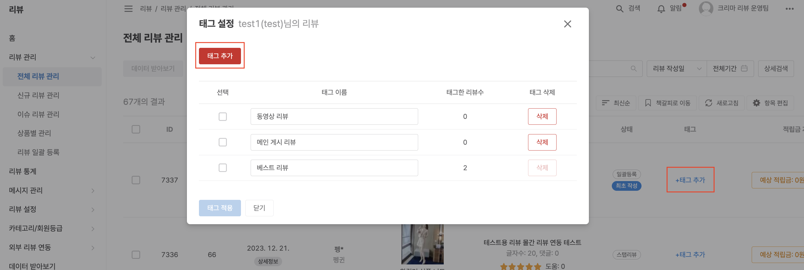 : 관리자 페이지 > 리뷰 > 전체 리뷰 관리 > 리뷰의 태그 추가