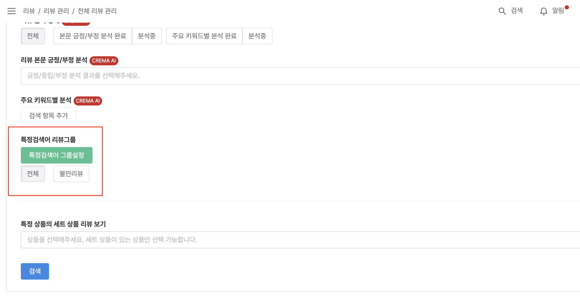 : 관리자페이지 > 리뷰 관리 > 전체 리뷰 관리 > 상세 검색 > 특정 검색어 그룹 설정 > 그룹별 검색 단어 설정