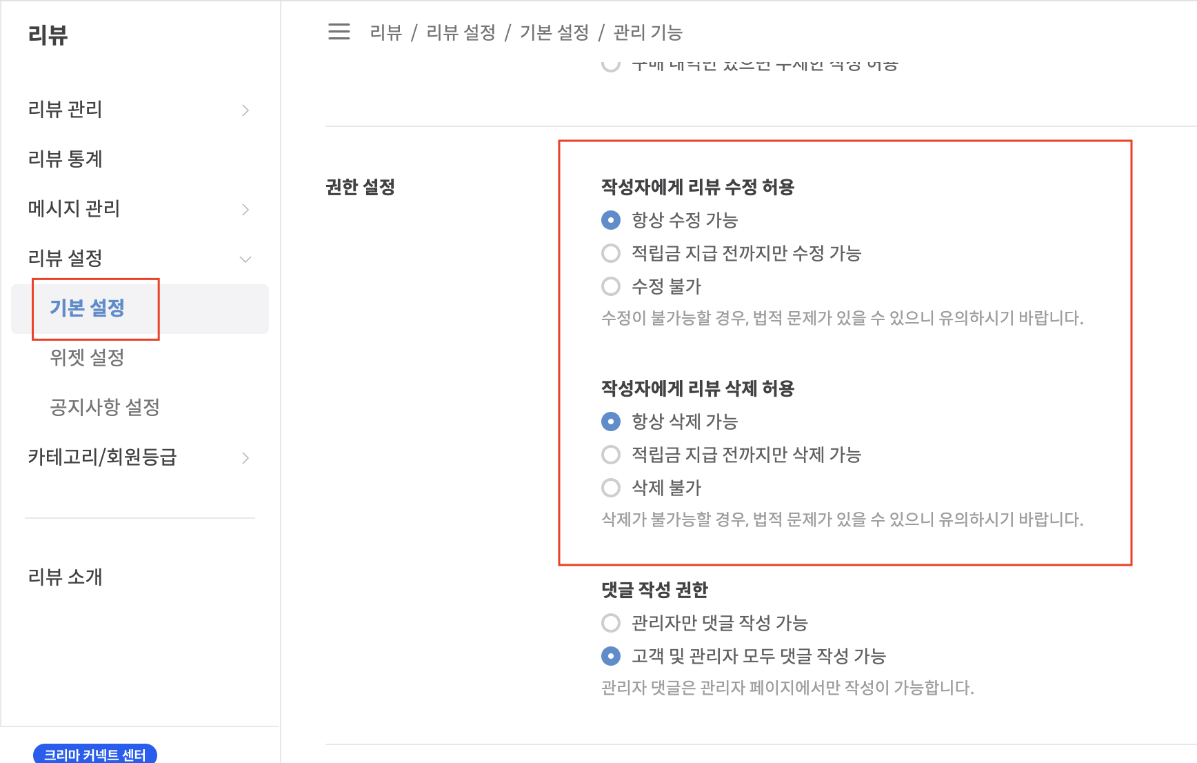 : 관리자 페이지 > 리뷰 > 리뷰 설정 > 기본 설정 > 권한 설정 > 작성자에게 리뷰 수정 허용 / 작성자에게 리뷰 삭제 허용