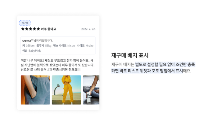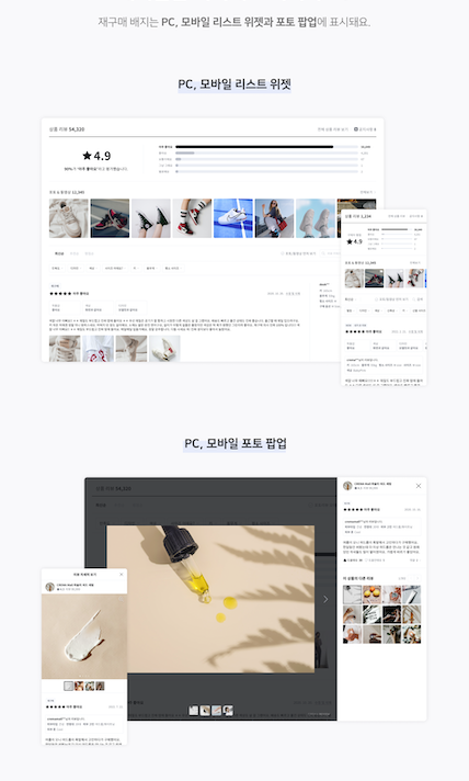 - ‘재구매 배지' 는 PC, 모바일 리스트 위젯과 포토 팝업에 표시됩니다.