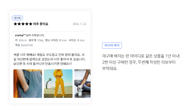 - 같은 아이디를 기준으로 최근 1년(365일) 이내 동일한 상품을 2회 이상 구매하여 작성된 리뷰에 노출됩니다. (단, 동일한 상품의 기준은 상품 번호로 구분하며, 옵션은 고려하지 않음)