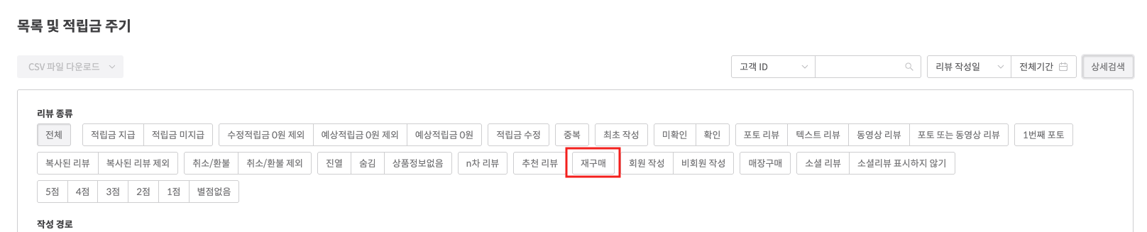 - 검색 방법 : 리뷰관리 > 전체 리뷰 관리 > 상세 검색 > 리뷰 종류 ‘재구매’ 선택