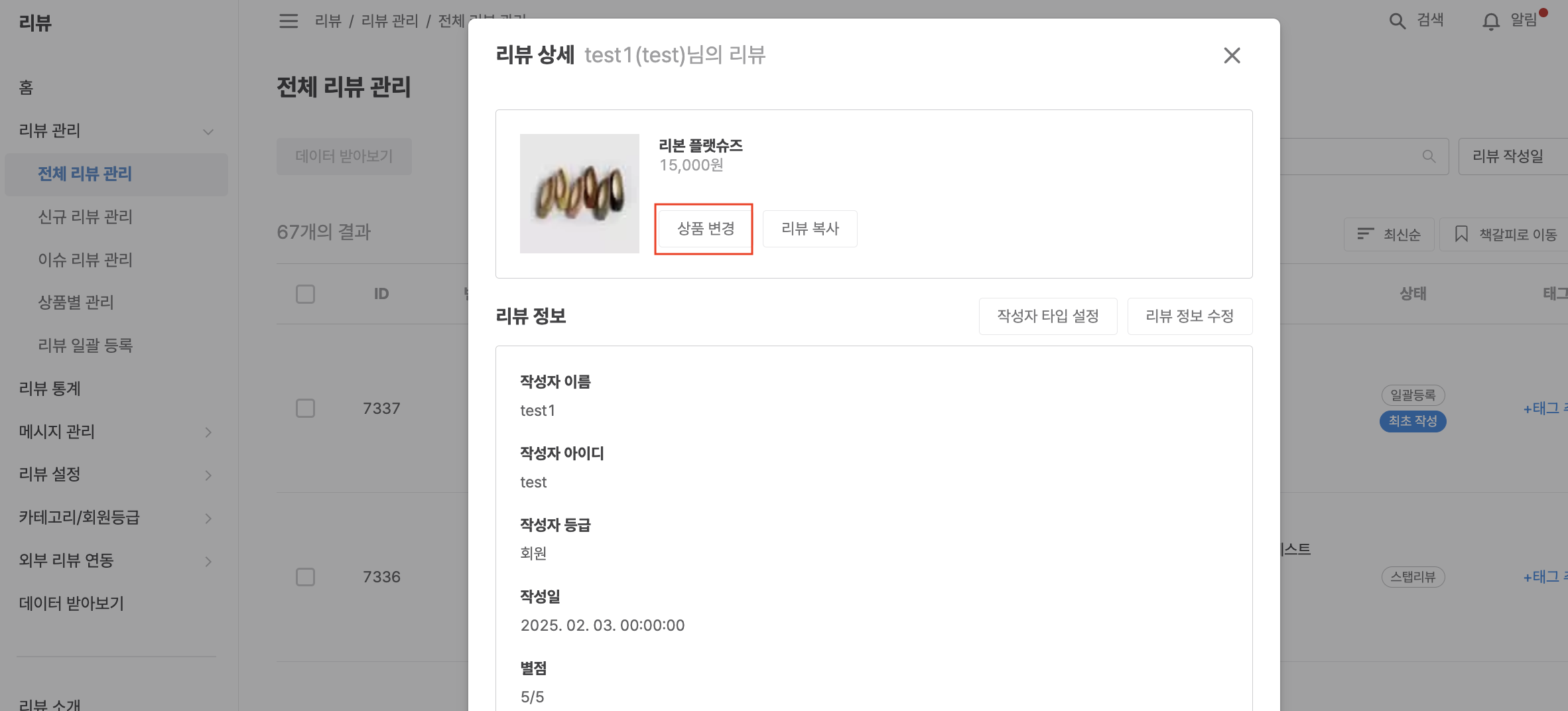 [리뷰] 리뷰 상품 변경 2025년 12월 30일 02:33 업데이트 시간 리뷰에 매칭된 상품을 변경하고 싶어요. 이미 작성된 리뷰의 상품을 다른 상품으로 변경할 수 있습니다. 단, 변경된 상품의 상태에 따라 리뷰 노출이 달라질 수 있으므로 변경하고자 하는 상품의 '적립금 설정, 상품 진열 여부' 등을 고려하여 변경해주세요. 설정 방법 : 관리자 페이지 > 리뷰 관리 > 전체 리뷰 관리 > 리뷰 클릭 > 상품 변경 > 변경하고자 하는 상품을 선택한 후 [상품 변경] 버튼 클릭 관련 문서 [리뷰] 메이크샵 부운영자 생성 및 권한 위임 설정 [리뷰] 호스팅사 이전 작업 신청서 [리뷰] 상품 카테고리 관리 - 수정/삭제 [리뷰] 호스팅사로 리뷰 데이터를 이관하고 싶어요 - 크리마 리뷰 이관 [리뷰] 평점+리뷰 수 설치/변경/제거 신청