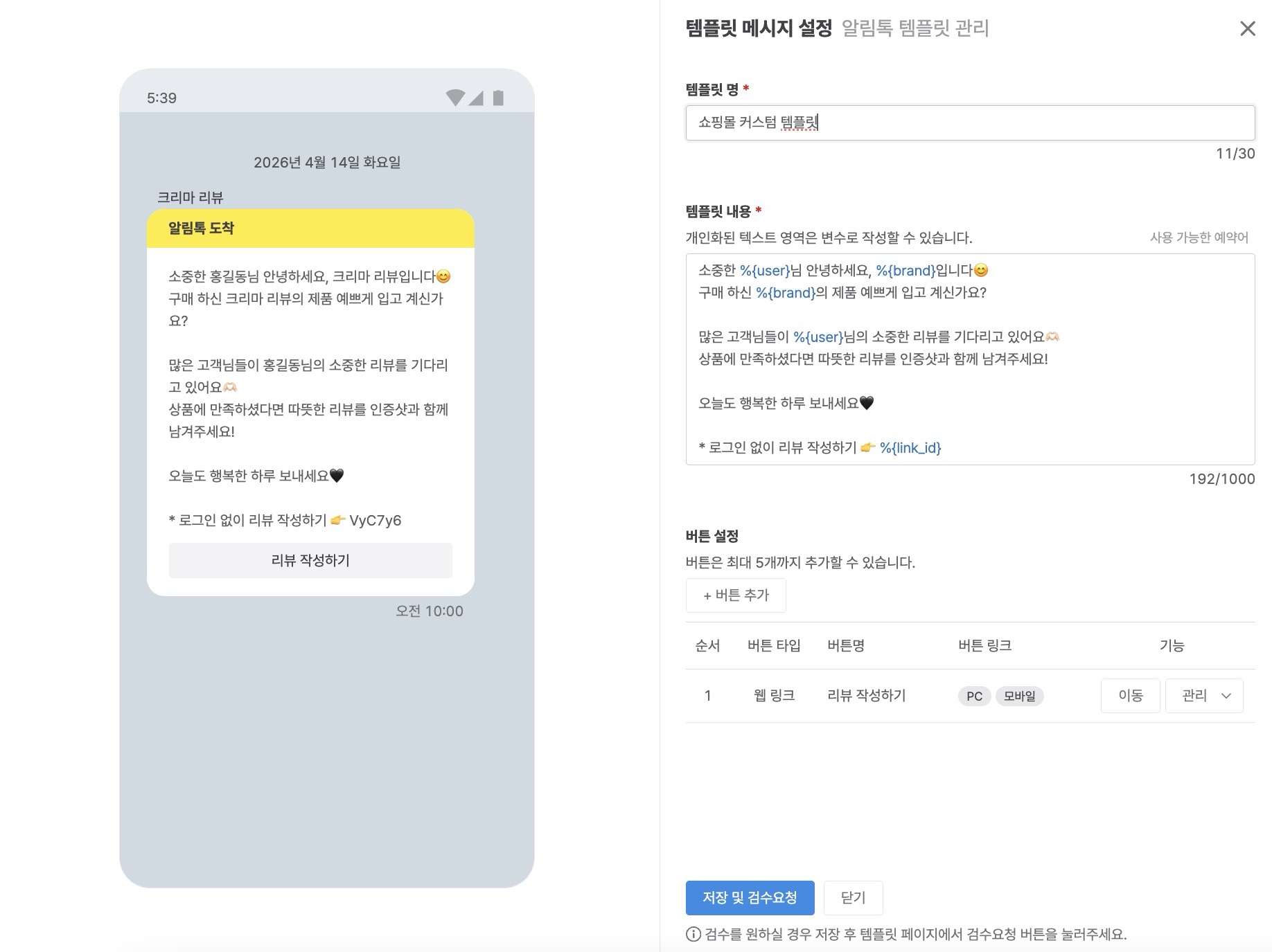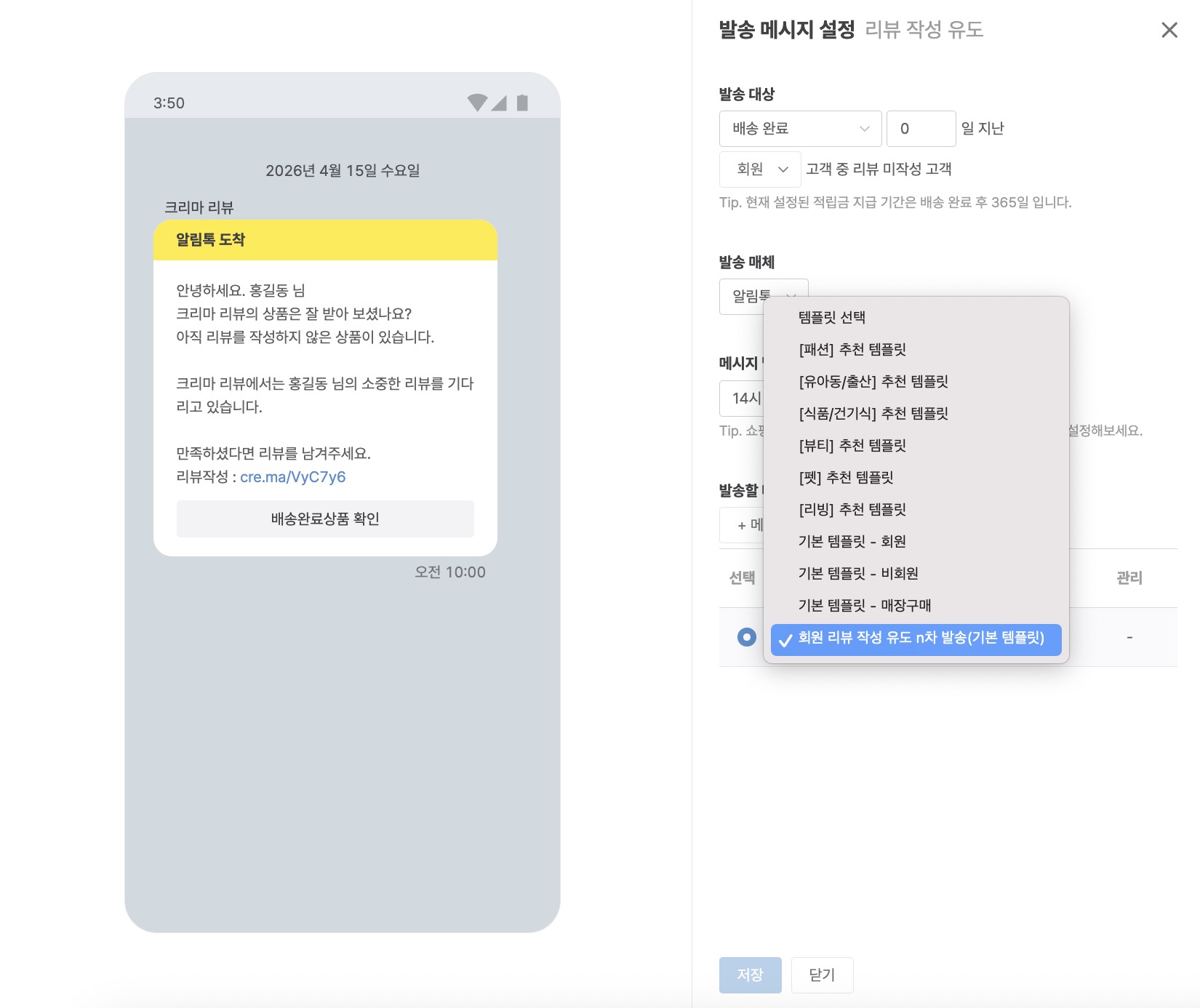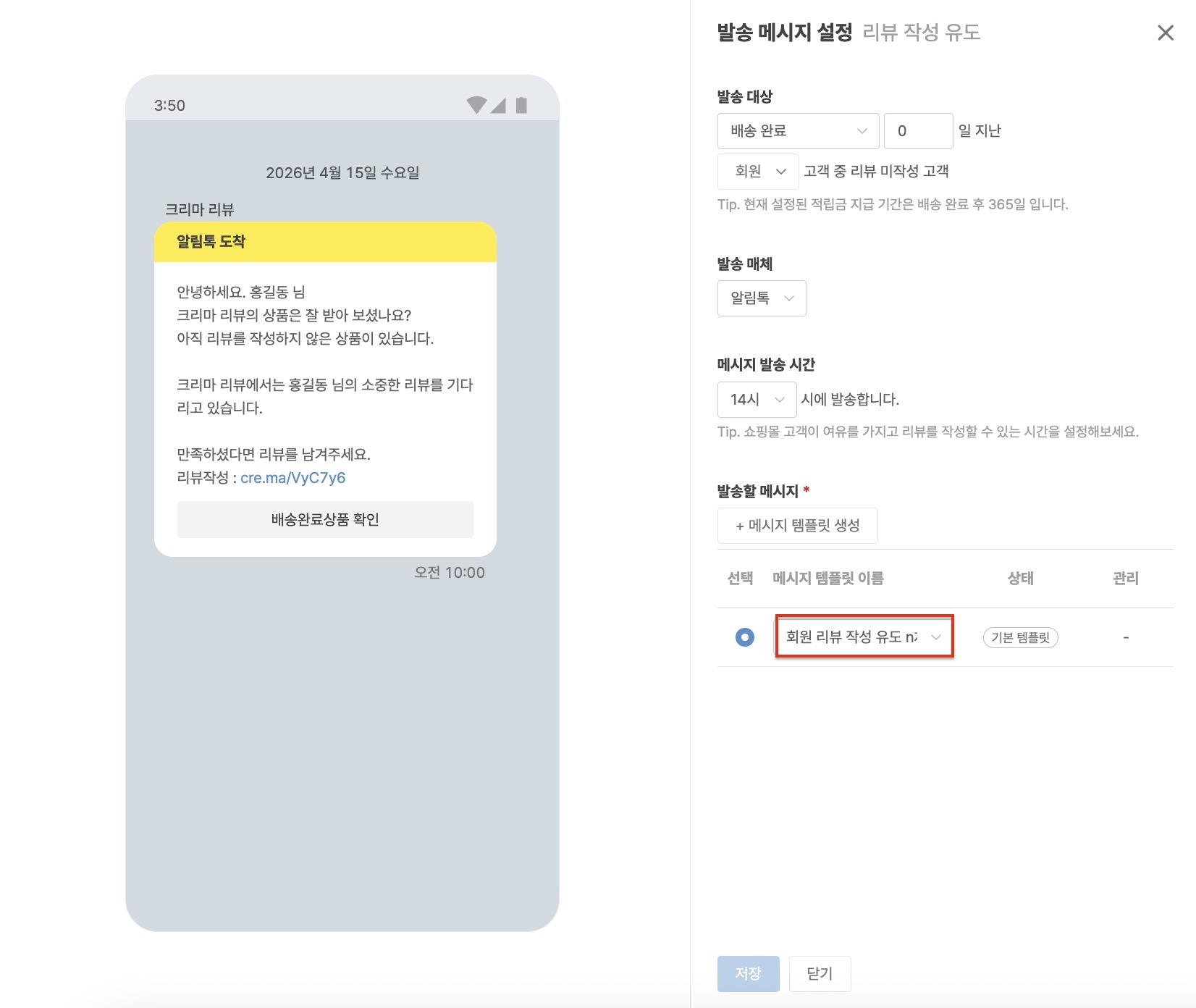 - 메시지에 사용 가능한 예약어 : 고객명, 쇼핑몰명, 쇼핑몰 대표 전화번호, 리뷰 작성 URL 키값