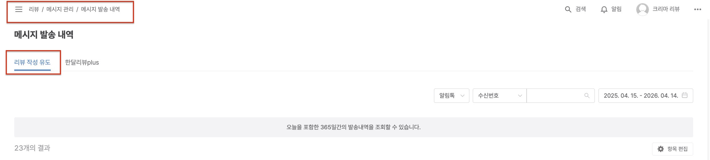 리뷰 > 메시지 관리 > 메시지 발송 내역