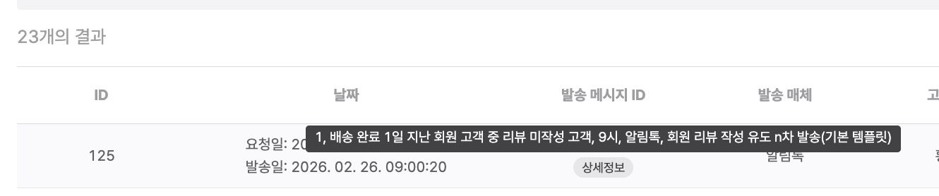 👉 크리마 관리자 페이지의 리뷰 > 메시지 관리 > 메시지 발송 내역 메뉴에서 확인하실 수 있습니다.