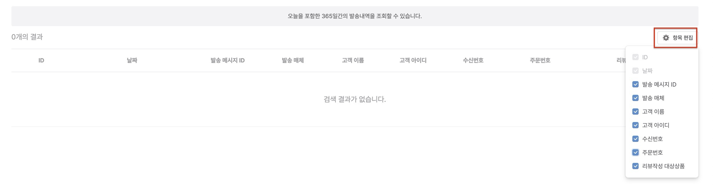 메시지 발송 내역에서는 아래와 같은 정보들을 제공하며, [항목 편집] 버튼을 통해 노출할 항목을 직접 구성할 수 있습니다.