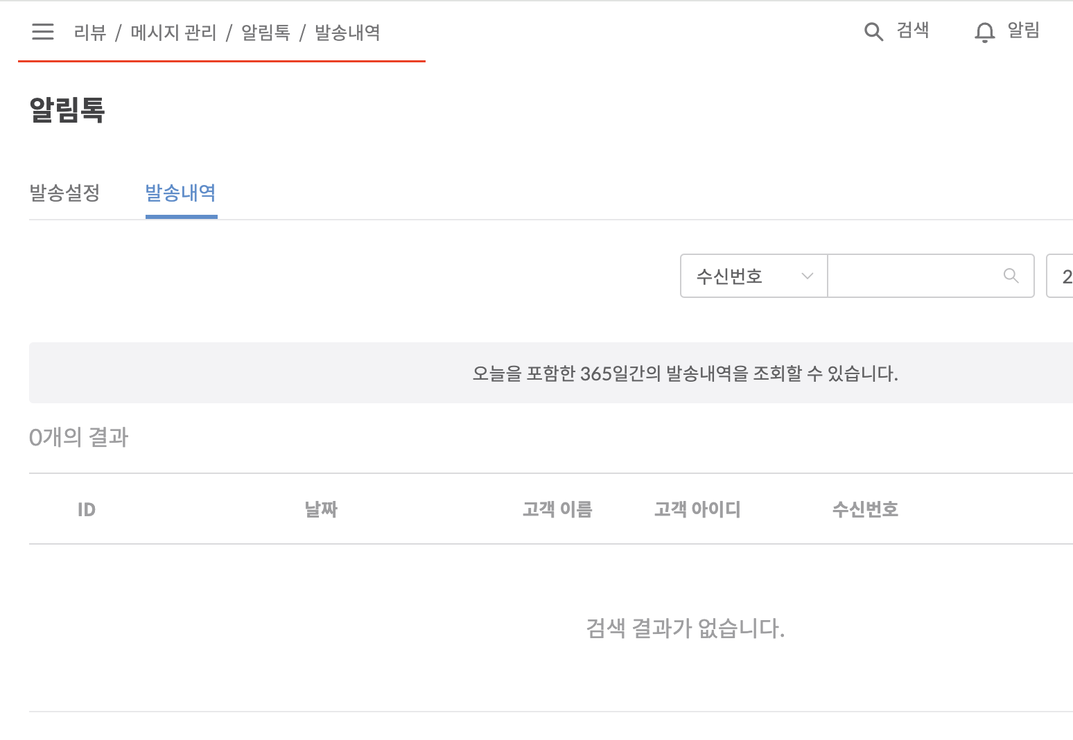 발송 내역에서 수신 번호 / 주문 번호 / 고객 이름 / 고객 아이디 + 기간을 통한 세부적인 검색도 가능합니다.